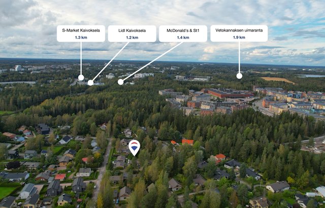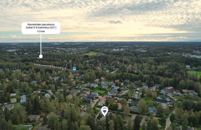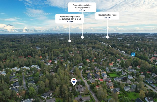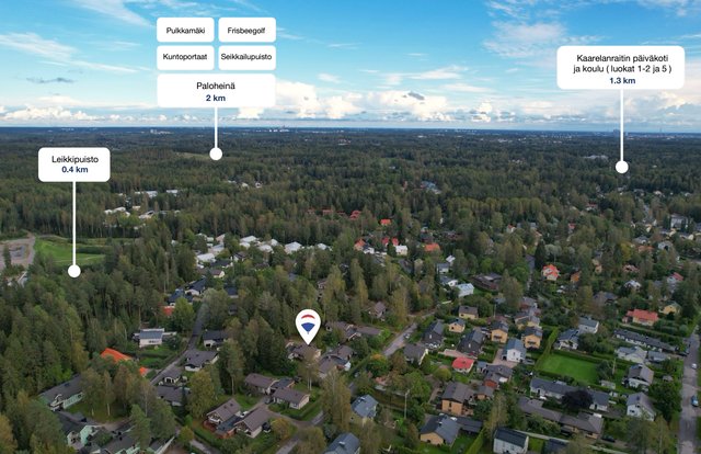 - PALVELUT: 1.2 km - Lidl Kaivoksela 1.3 km - S-Market Kaivoksela 1.3 km - St1 huolto-asema 1.4 km - McDonald’s Kaivoksela 2.5 km - Kauppakeskus Kaari ULKOILU JA LIIKUNTA 400 m - Leikkipuisto 400 m - Hiihtoladut 1 km - Palettilammen uimaranta 1.4 km - Kaarelan jäähalli 1.7 km - Pitkäkosken koirapuisto 1.9 km - Vetokannaksen uimaranta 2 km - Paloheinän pulkkamäki 2 km - Paloheinän frisbeegolf 2.4 km - Paloheinän portaat 2.4 km - Seikkailupuisto Korkee 2.4 km - Paloheinän jäähalli 2.5 km - Kuntokeskus Liikku 3.2 km - Paloheinä golf PÄIVÄKODIT: 700 m - Päiväkoti Kuninkaantammi 1.4 km - Päiväkoti Kaarelanraitti 2.0 km - Gruppfamiljedaghemmet Lyckostugan 2.4 km - Päiväkoti Kalinka KOULUT: 700 m - Kannelmäen peruskoulu, luokat 1-4 1.3 km - Kannelmäen peruskoulu, 5. luokka 1.3 km - Kannelmäen peruskoulu, luokat 5-9 (2027) 2.5 km - Suomalais-venäläinen koulu 2.8 km - Kannelmäen peruskoulu, luokat 6-9 JULKISET YHTEYDET: 650 m - Kuninkaantammenaukio (Linjat 52, 431N, 560, 560N) 700 m - Kalannintie, Hämeenlinnanväylä (useita bussilinjoja) 2.4 km - Kannelmäen juna-asema 2.4 km - Malminkartanon juna-asema MATKA-AJAT BUSSILLA 2 min - Bussit Hämeenlinnanväylältä Kaareen 18-33 min - Bussit Hämeenlinnanväylältä Kamppiin 11 min - Bussit Kuninkaantammenaukiolta juna-asemalle 13 min - Bussit Kuninkaantammenaukiolta Kaareen MATKA-AJAT JUNALLA: 14 min - Kannelmäestä Päärautatieasemalle 16 min - Malminkartanosta Päärautatieasemalle