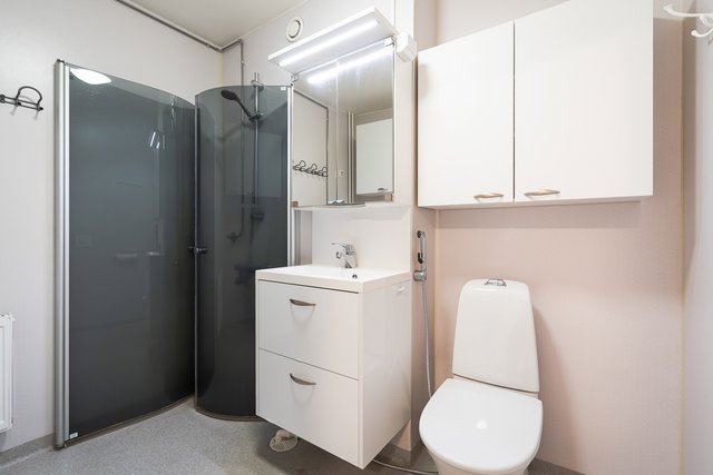 - WC-istuin, pesuallas, peilikaappi, bidee-suihku, suihkuseinä, suihku, ja allaskaappi
