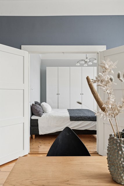 - Iso makuuhuone, josta pariovet olohuoneeseen. Tilavat vaatekaapit.