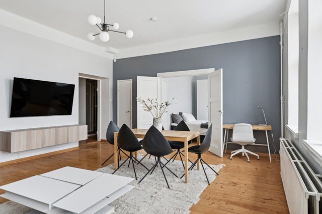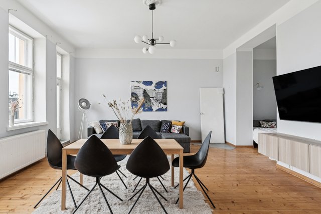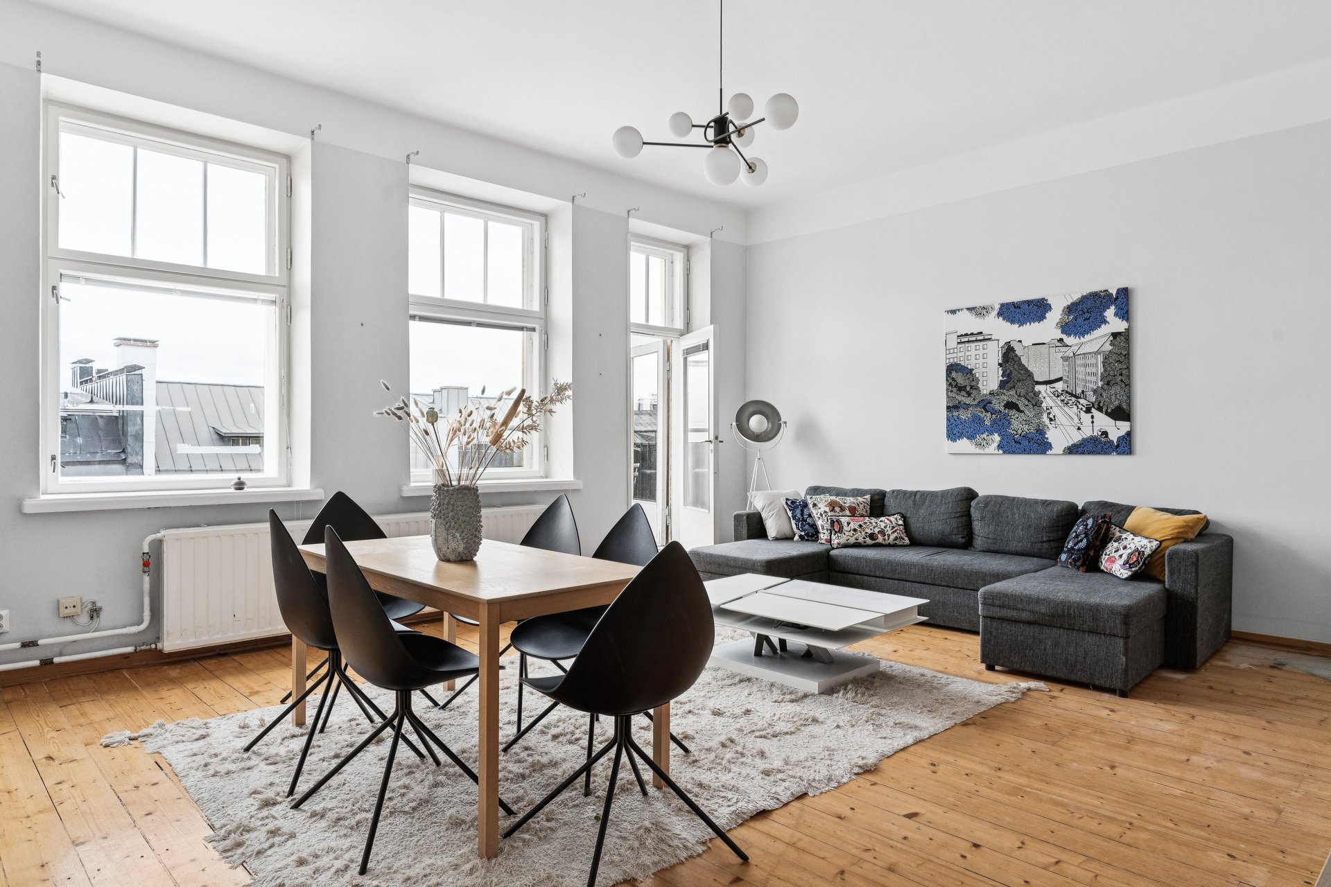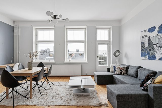 - Iso valoisa olohuone, josta käynti taloyhtiön sisäpihalle suuntaavalle parvekkeelle. Olohuoneen yhteydessä alkovi.