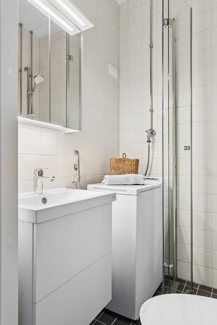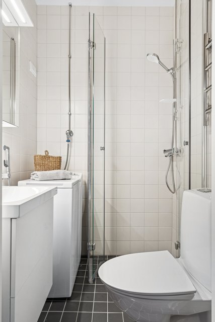 - WC-istuin, suihku, suihkuseinä, pesukoneliitäntä, allaskaappi, bidee-suihku, peilikaappi, ja pesuallas