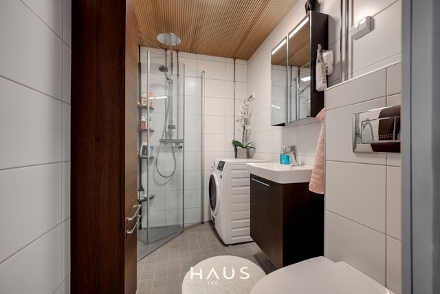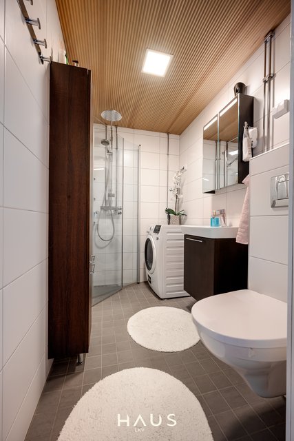 - WC-istuin, suihkuseinä, lattialämmitys, peilikaappi, pesuallas, allaskaappi, bidee-suihku, ja pesukoneliitäntä