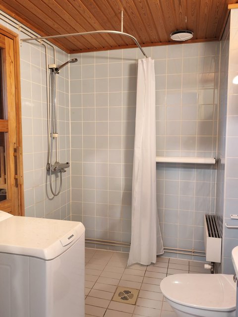 - WC-istuin, suihku, pesukoneliitäntä, peilikaappi, ja allaskaappi