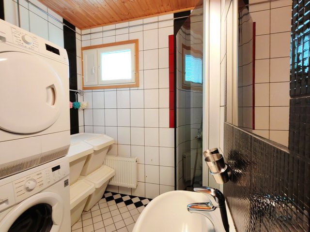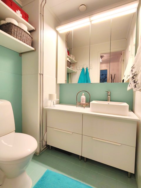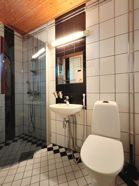 - WC-istuin, suihku, suihkuseinä, pesukoneliitäntä, lattialämmitys, peilikaappi, ja peili