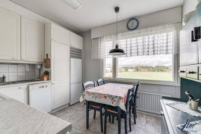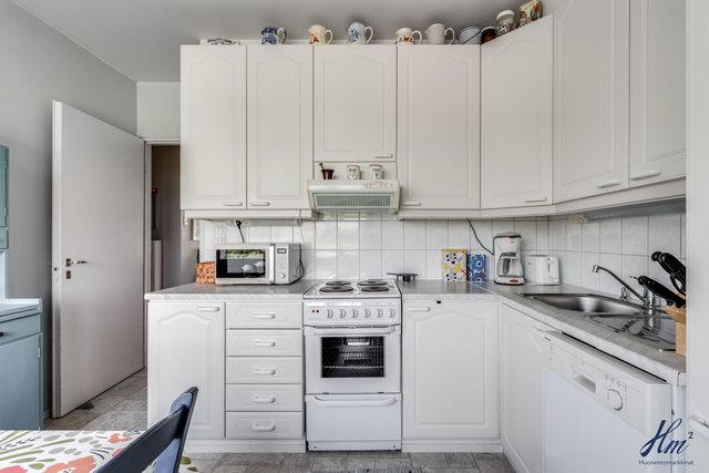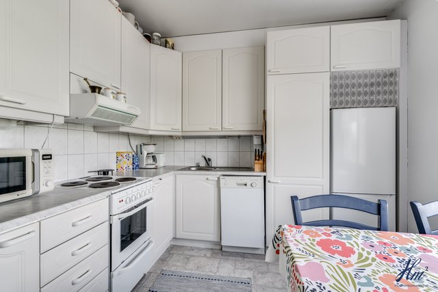 - Kaapistot, sähköliesi, liesituuletin, jää-/pakastekaappi ja astianpesukone. Keittiön lattiapinta on laminaattia ja seinäpinnat on maalattu.
