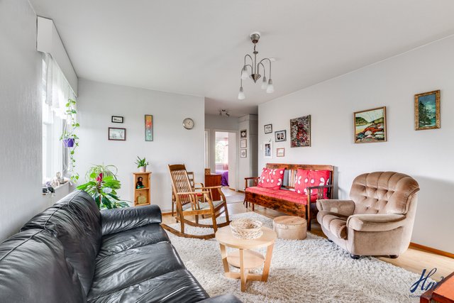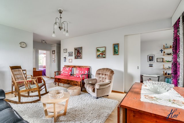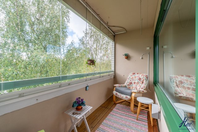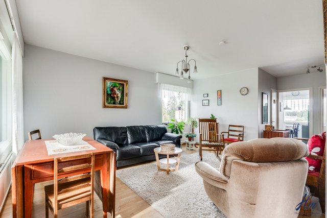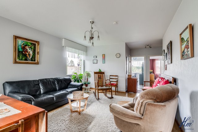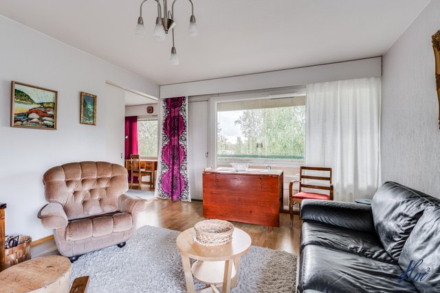 - Olohuoneen lattiapinta on laminaattia ja seinäpinnat on maalattu. Olohuoneesta on kulku lasitetulle parvekkeelle.