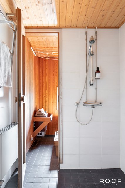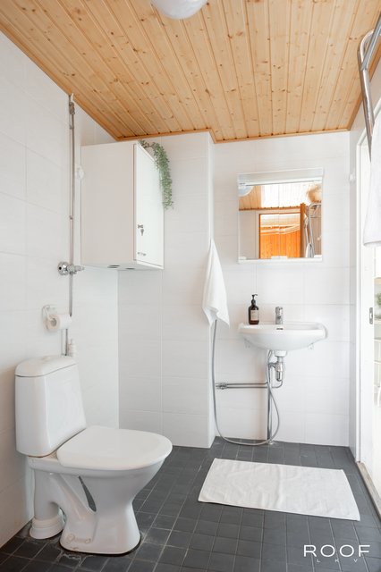 - WC-istuin, suihku, pesukoneliitäntä, pesuallas, peilikaappi, ja seinäkaappi