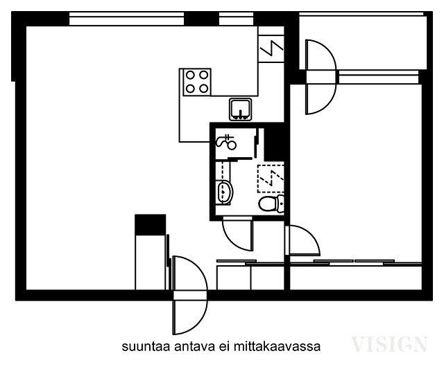 - Suihkukaappi, lattialämmitys, wc-istuin, pesukoneliitäntä, ja kiinteät valaisimet