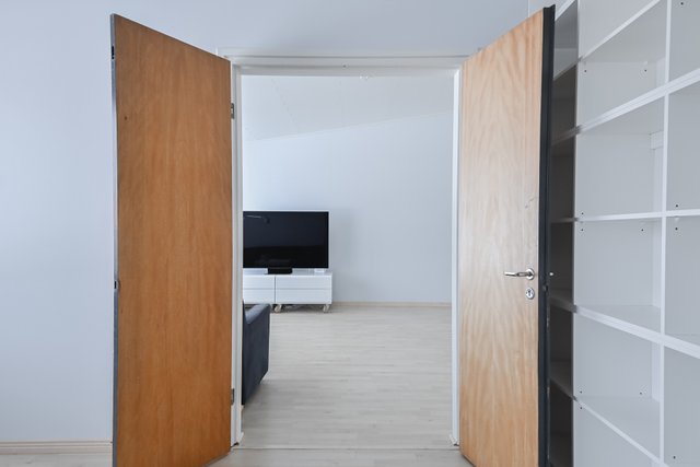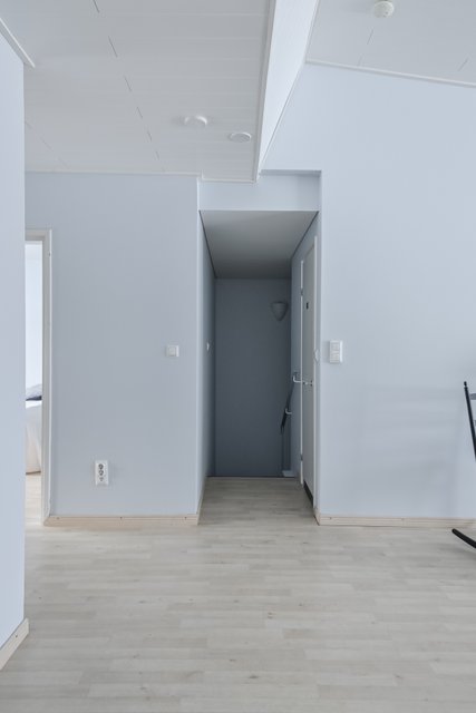 Yläkerrassa on olohuone, jonka korkea viistokatto antaa ihanasti ilmavuutta tilaan. Keittiö yhdistyy saumattomasti olohuoneeseen ja ruokailulle on myös oma tilansa. Yläkerrassa on kaksi mukavan kokoista makuuhuonetta, joista toisessa on kaapistot ja toisessa vaatehuone. Lisäksi yläkerrasta löytyy wc, jonka yhteydessä on suihkutila.