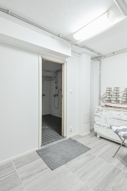Tämän kodin alakerrassa on tilava eteinen säilytyskaapistoin, erillinen wc, kodinhoitohuone, pukuhuone, kylpyhuone ja sauna. Säilytystilaa löytyy vaatehuoneesta sekä portaiden alla olevasta komerosta.