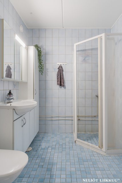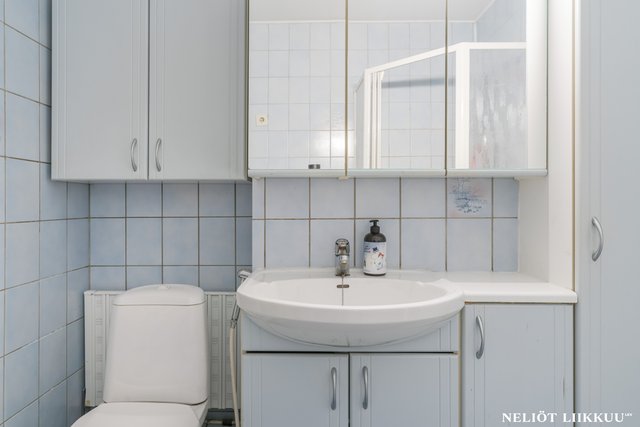 - WC-istuin, suihku, peilikaappi, pesukoneliitäntä, pesuallas, ja allaskaappi