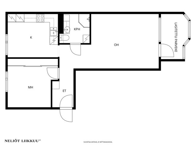 Tässä toimivassa asunnossa on eteinen, hyvänkokoinen siisti keittiö, valoisa olohuone, makuuhuone ja kylpyhuone. Iso lasitettu parveke, josta näkymät urheilukentälle.