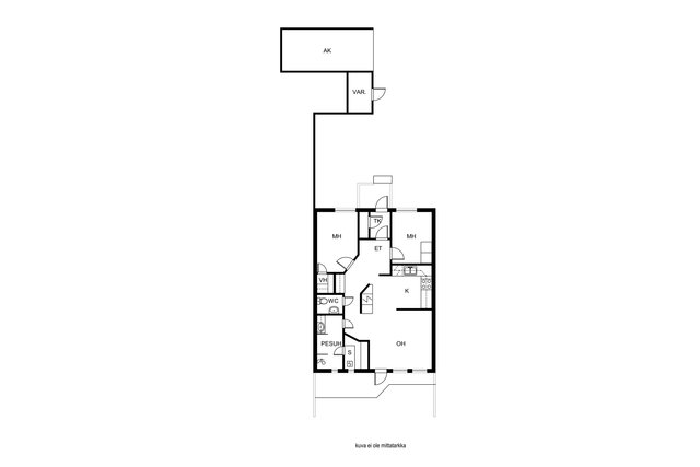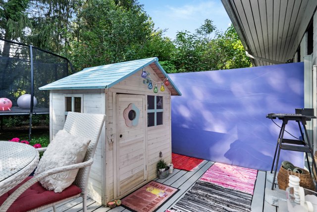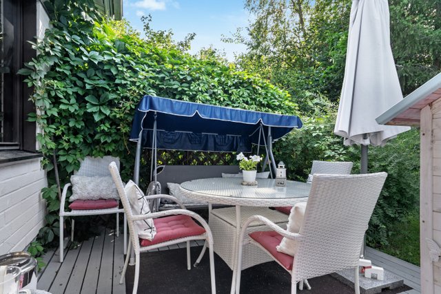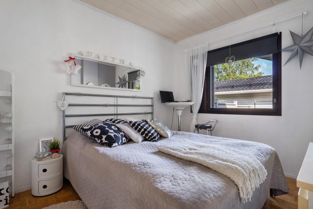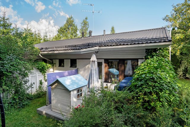 Oma terassi ja piha ovat etelään suuntaan talon suojaisalla puolella. Säilytystilaa tarjoaa hyvin kiinteät kaapistot sekä isomman makuuhuoneen vaatehuone.