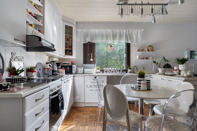 - Jääkaappi, erillinen pakastin, uuni, liesi, liesituuletin, ja astianpesukone