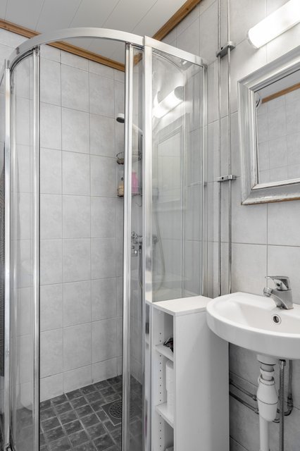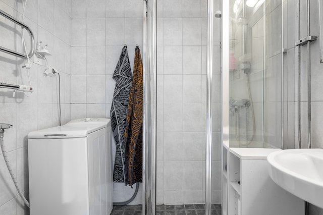 - WC-istuin, suihkukaappi, suihku, pesukoneliitäntä, peili, ja pesuallas