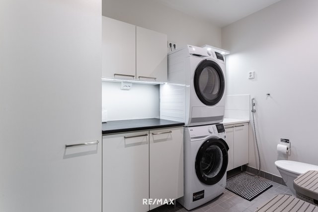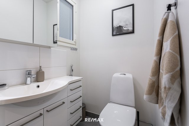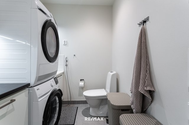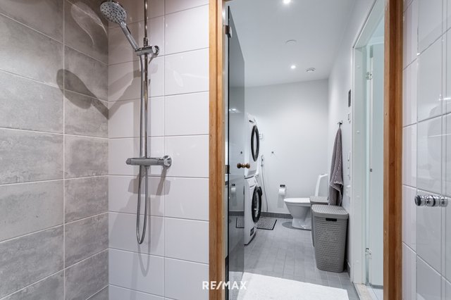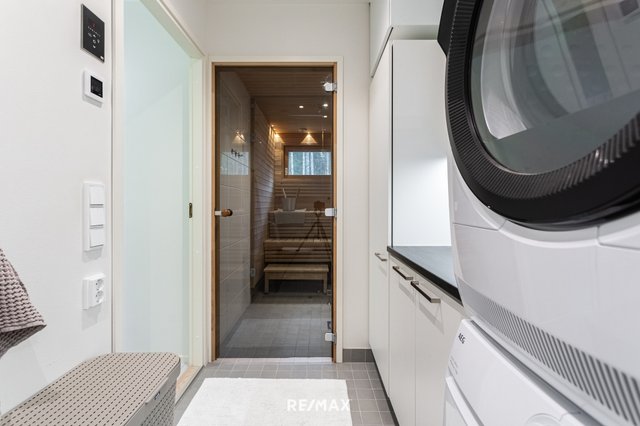 Kodin kylpyhuoneet ovat siistit ja modernit. Alakerrassa on oma erillinen wc, yläkerrassa taas tyylikäs pesuhuone, sauna sekä wc kodinhoitohuoneen yhteydessä. Kodinhoitotila yläkerrassa tekee arjesta sujuvaa, ja toimivat säilytysratkaisut pitävät kokonaisuuden selkeänä.