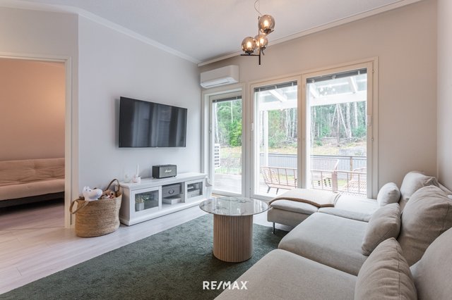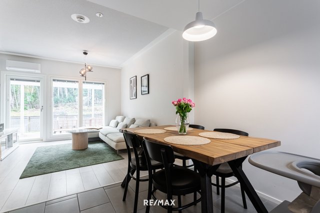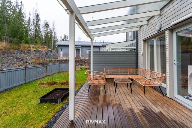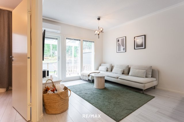 Sisääntulo avautuu ilmavaan oleskelualueeseen, jossa suuret ikkunat tuovat luonnonvalon osaksi sisustusta. Keittiö on raikas ja moderni, ja ruokailupöydälle jää hyvin tilaa. Olohuone jatkuu sujuvasti kohti katettua terassia, joka toimii pitkälle syksyyn yhtenä kodin parhaista oleskelupaikoista. Terassin jatkeena on pieni piha, ja talon takana alkaa rauhallinen metsäkaistale.