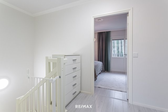Yläkerran makuuhuonekerroksessa on tilava aula, kaksi makuuhuonetta ja toisen huoneen yhteydessä on vaatehuone. Kokonaisuus tuntuu toimivalta ja kodikkaalta. Tiloista löytyy sopiva paikka niin arjen askareille kuin rentoutumisellekin.