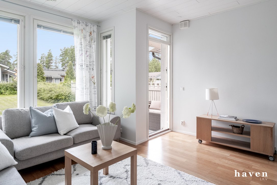 - Tilava olohuone josta käynti takapihalle.