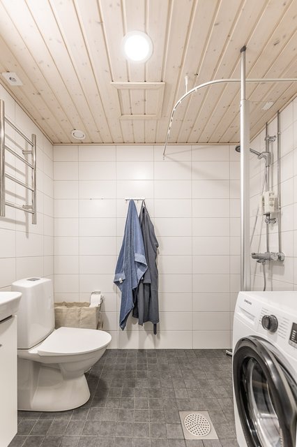 - WC-istuin, suihku, peilikaappi, pesukoneliitäntä, ja pesuallas