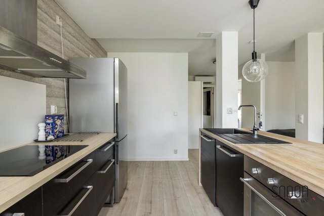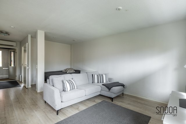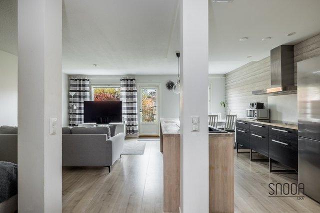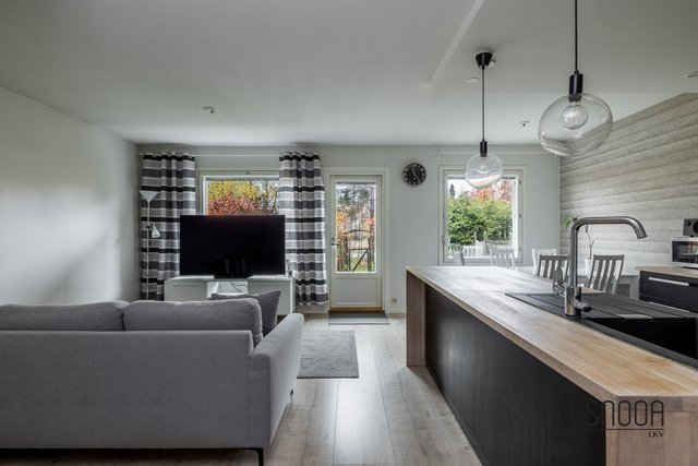Huoneistossa on toimiva pohjaratkaisu. Tilavaan ja valoisaan olohuoneeseen yhdistyy saumattomasti moderni keittiö. Vehreä terassi on aurinkoinen aamusta iltaan. Runsaat pensasaidat ja oma omenapuu tuovat omaa rauhaa ja viihtyvyyttä. Terassille mahtuu isompikin ruokailuryhmä grilleineen sekä esimerkiksi trampoliini ja palju.