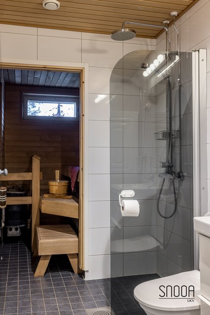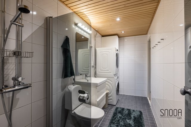- Suihku, lattialämmitys, suihkuseinä, pesukoneliitäntä, pesuallas, peilikaappi, wc-istuin, ja bidee-suihku