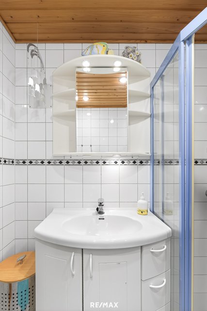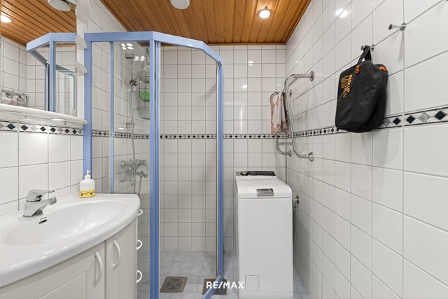 - Suihku, suihkuseinä, pesukoneliitäntä, pesukone (AEG), lattialämmitys, peilikaappi, ja allaskaappi