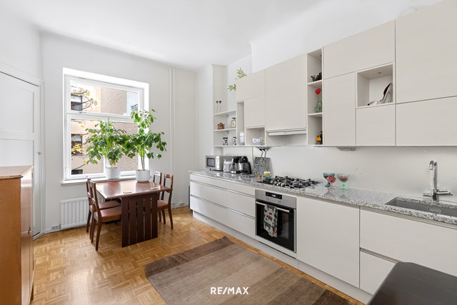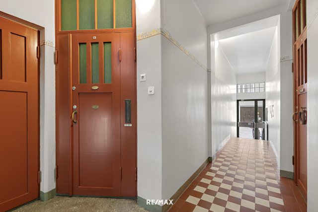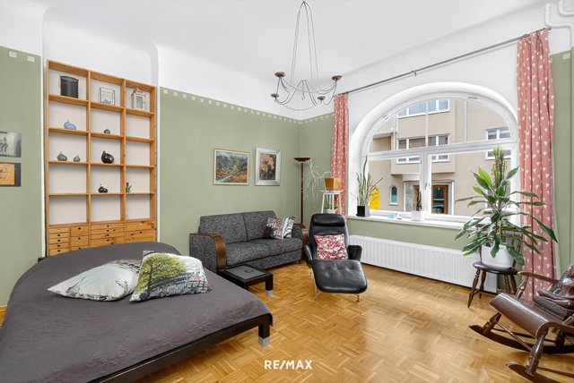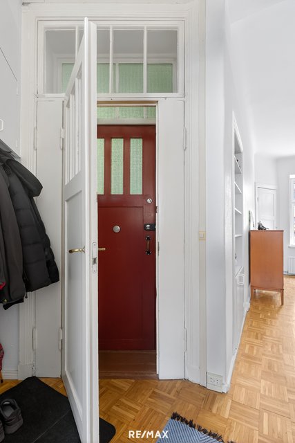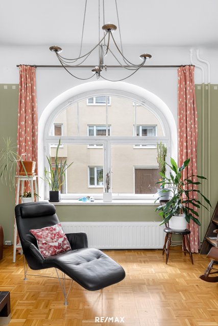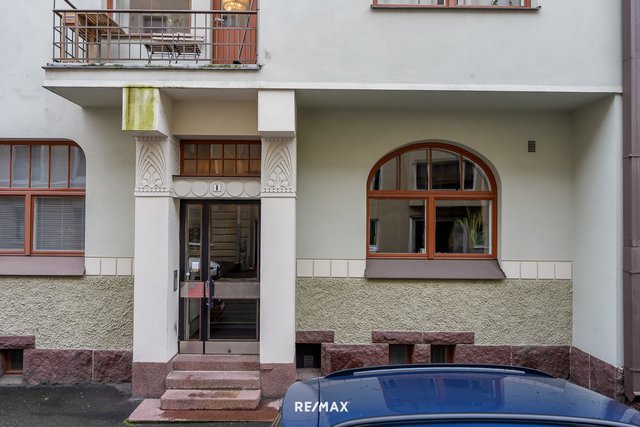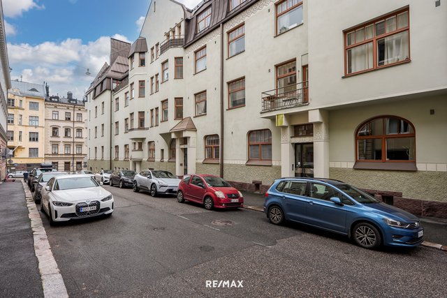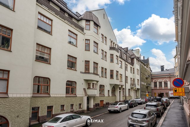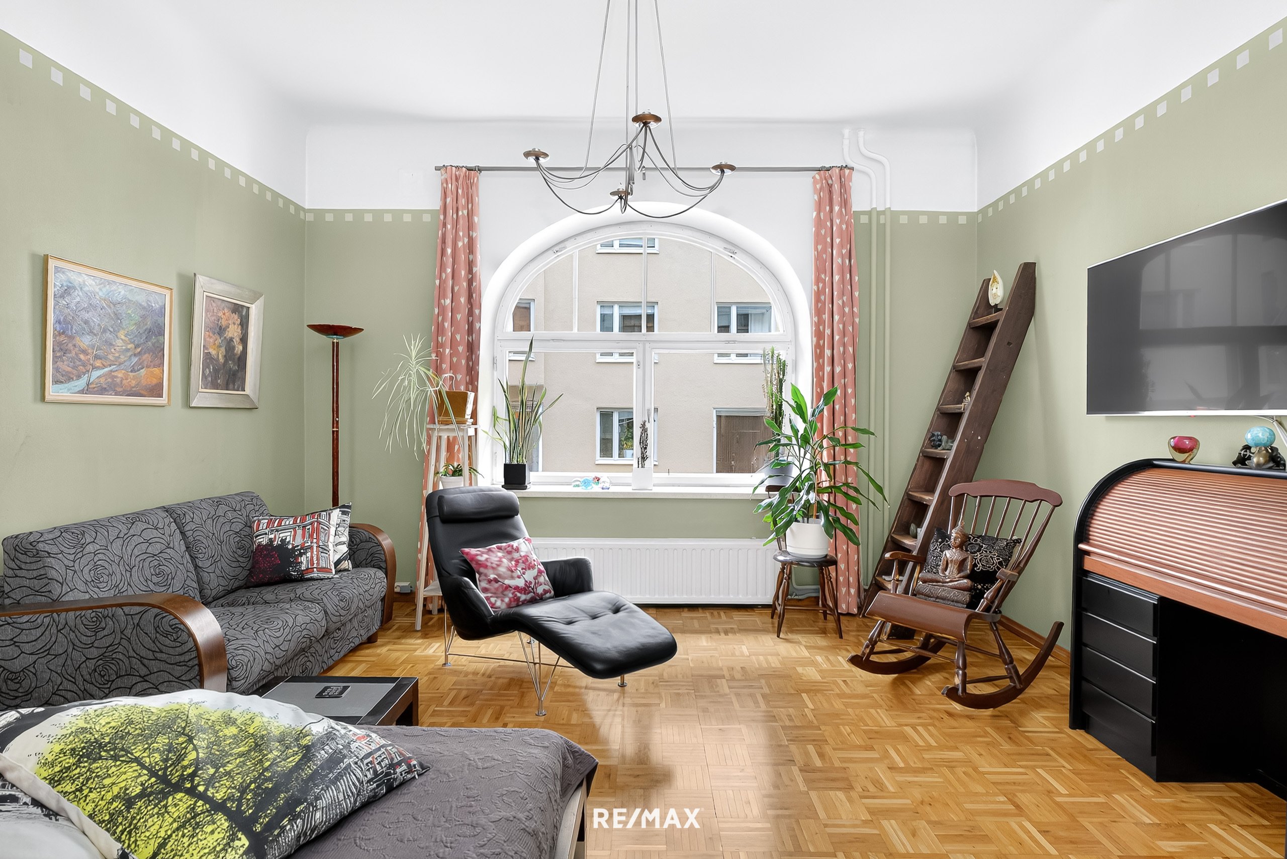 Vuonna 1908 rakennettu talo huokuu historiallista charmia, ja huoneiston korkeat huoneet sekä kaunis kaari-ikkuna luovat avaran ja valoisan tunnelman. Rapussa on hissi, mikä tekee arjesta sujuvaa.