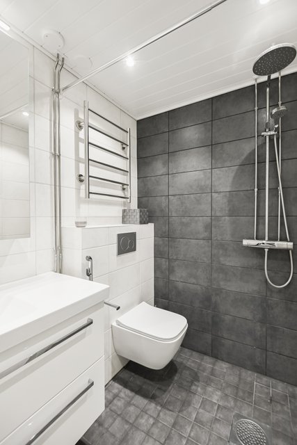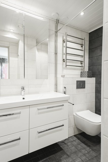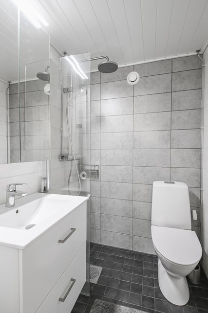 - WC-istuin, suihku, suihkuseinä, peilikaappi, pesuallas, allaskaappi, bidee-suihku, ja lattialämmitys