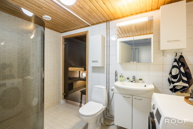 - Suihku, suihkuseinä, wc-istuin, bidee-suihku, peilikaappi, lattialämmitys, pesuallas, allaskaappi, pesukoneliitäntä, ja kaapisto