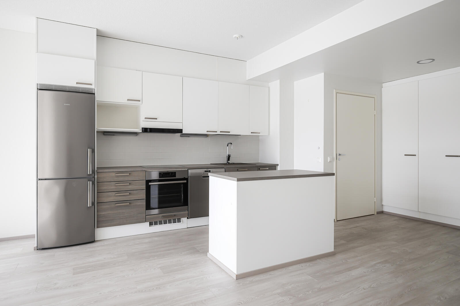- Jääkaappipakastin, erillisuuni, keittiösaareke, liesituuletin, astianpesukone, ja kiinteät valaisimet