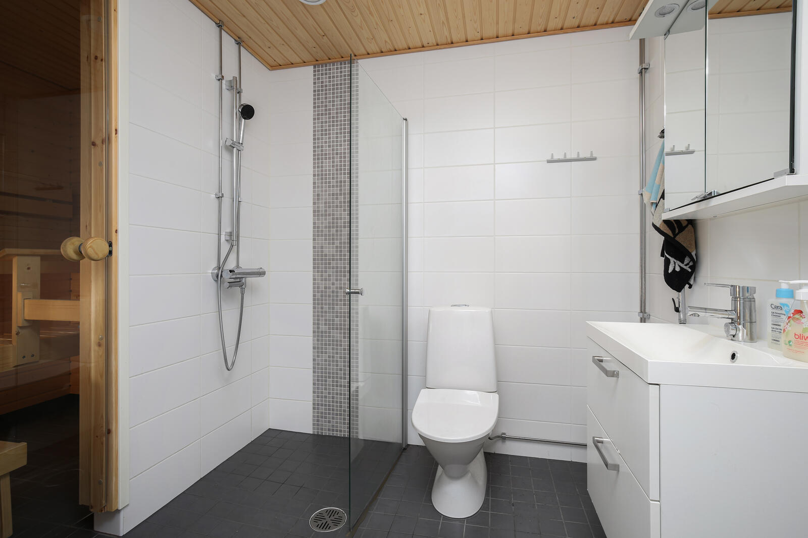 - Peilikaappi, suihkuseinä, suihku, pesukoneliitäntä, lattialämmitys, wc-istuin, ja kiinteät valaisimet