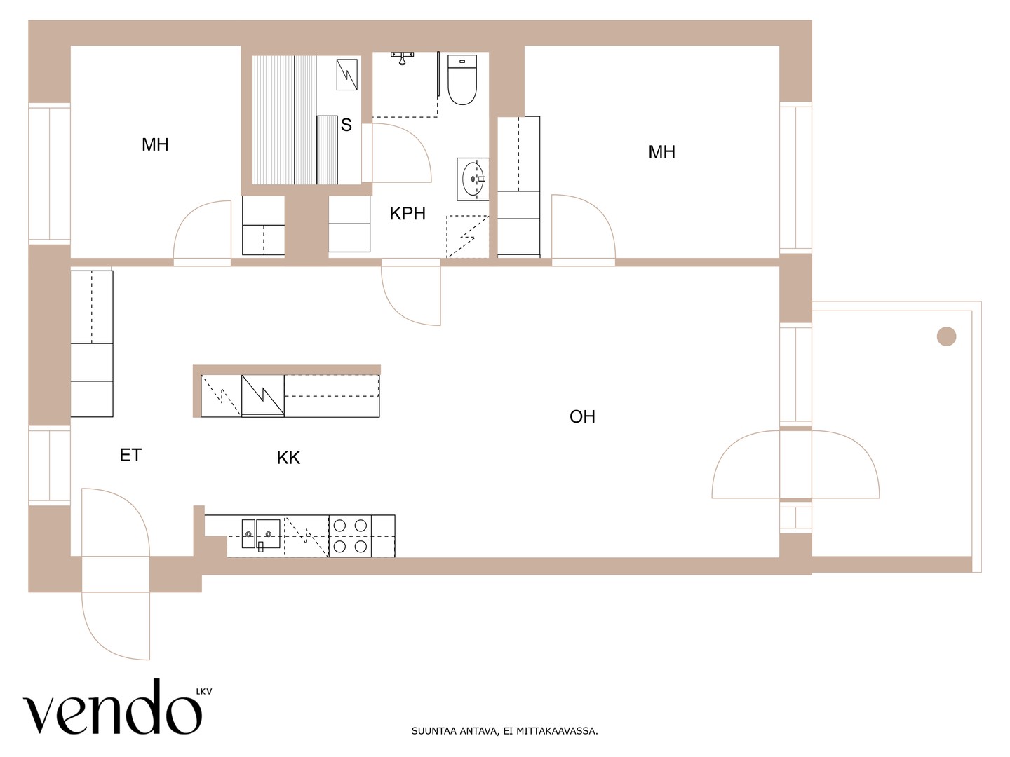 Vaaleasävyinen keittiö yhdistyy avaraan olohuoneeseen ja välitilaan mahtuu suurempikin ruokapöytä. Kaiken kruunaa iso lasitettu parveke, jonne paistaakin aurinko koko päivän.