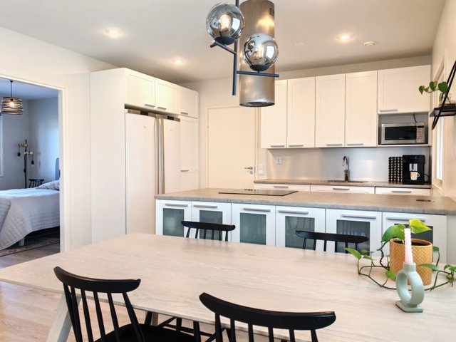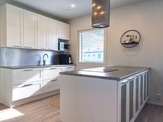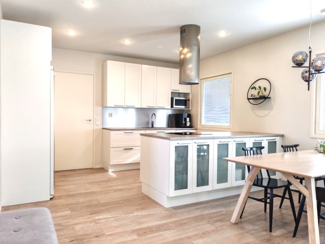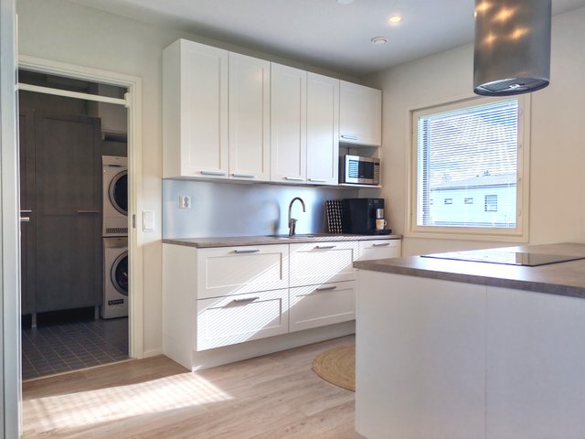 - Jääkaappi, erillinen pakastin, liesi, liesituuletin, uuni, astianpesukone, ja keittiösaareke