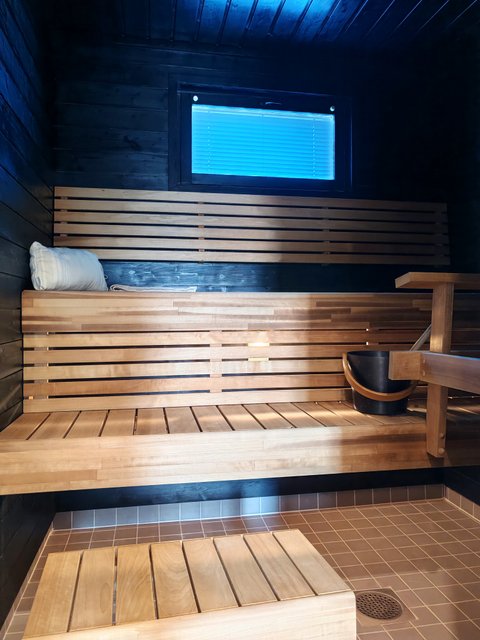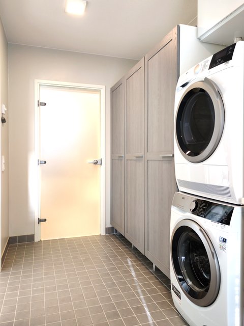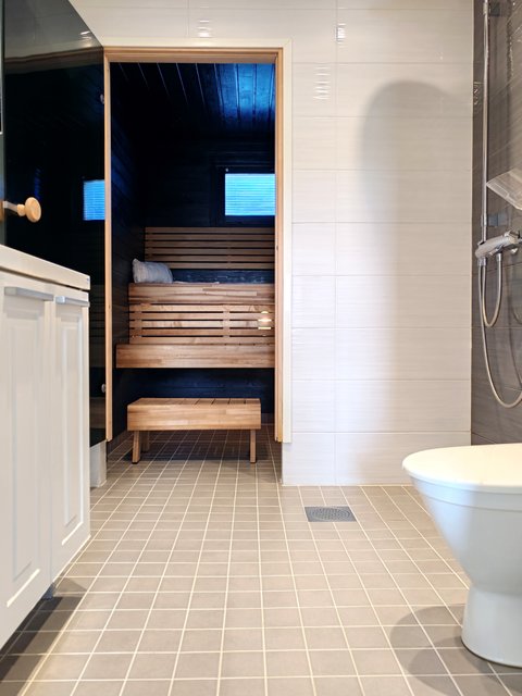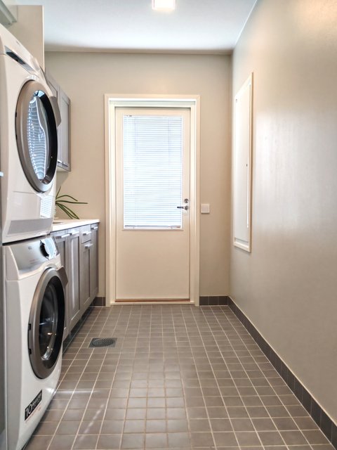 - Pesukoneliitäntä, lattialämmitys, pesuallas, pyykkikaapit, lattiakaivo, ja tila pesutornille