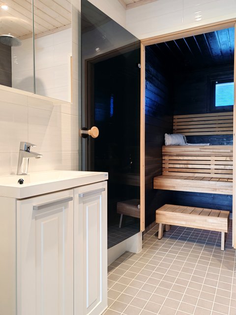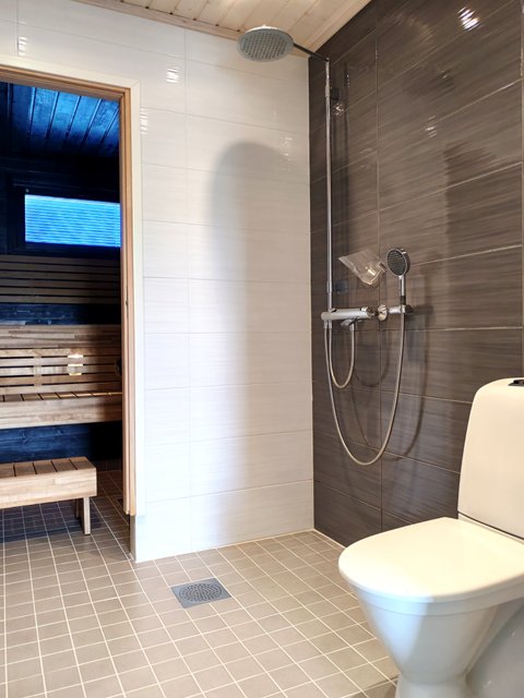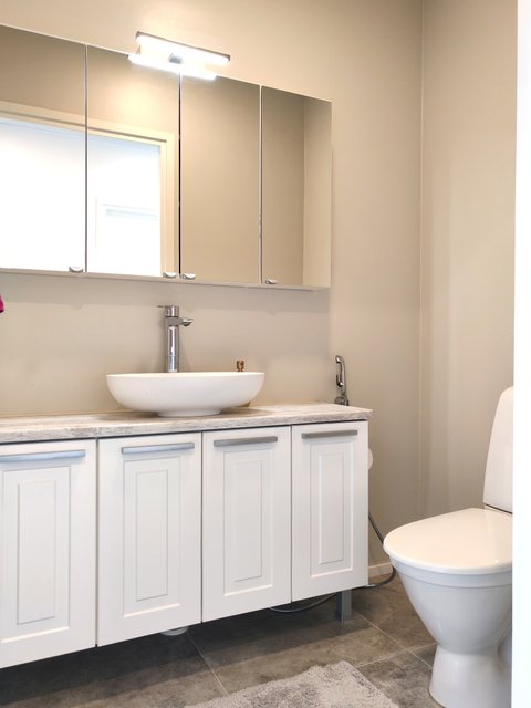 - WC-istuin, suihku, lattialämmitys, pesuallas, allaskaappi, bidee-suihku, ja peilikaappi