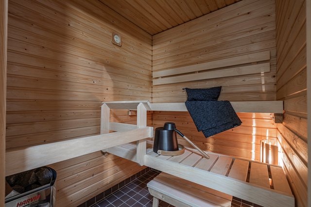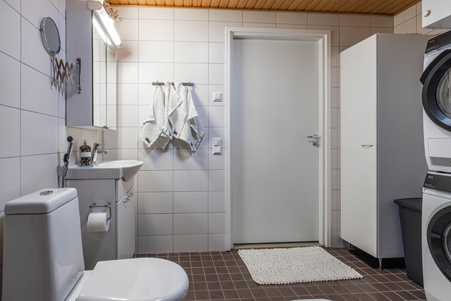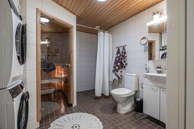 - WC-istuin, suihku, pesukoneliitäntä, lattialämmitys, peilikaappi, pesuallas, allaskaappi, ja bidee-suihku