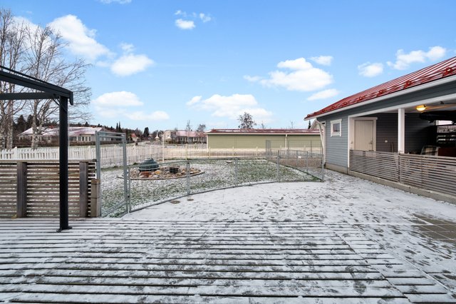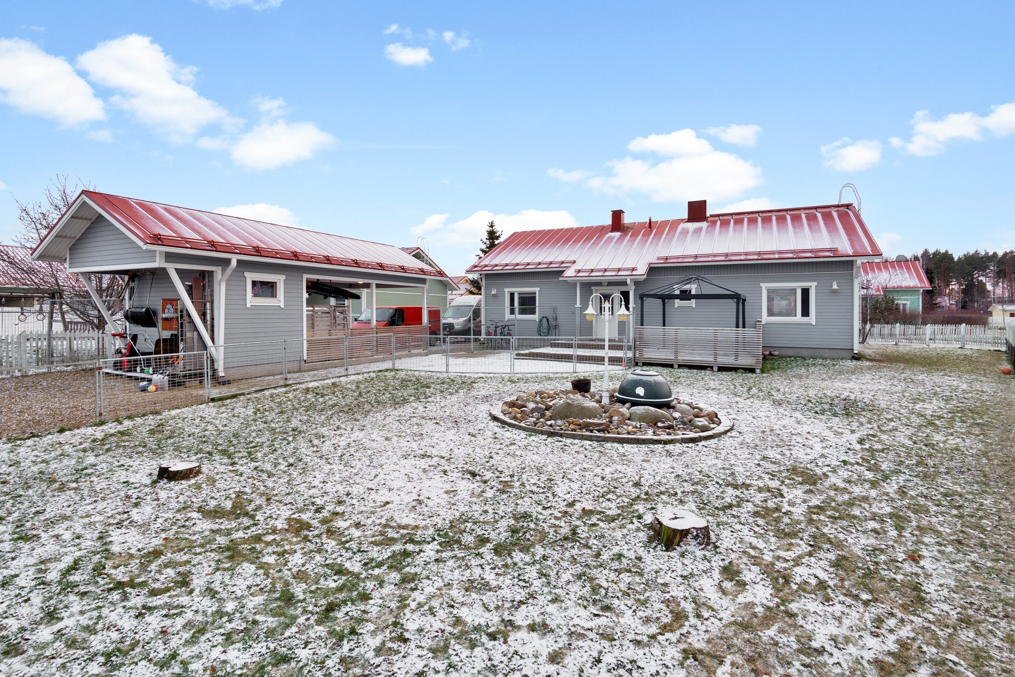 Tontilla lisäksi erillinen autokatosrakennus, jonka yhteydessä varastotila. Katoksen päätyyn lisäksi tehty katos puutarhavälineiden yms. säilytykseen.