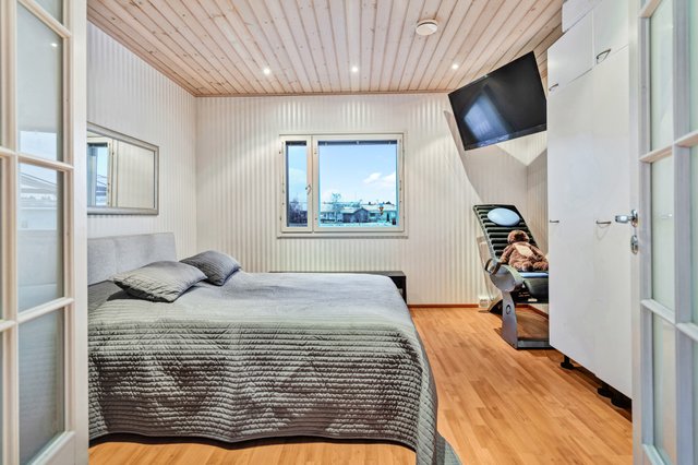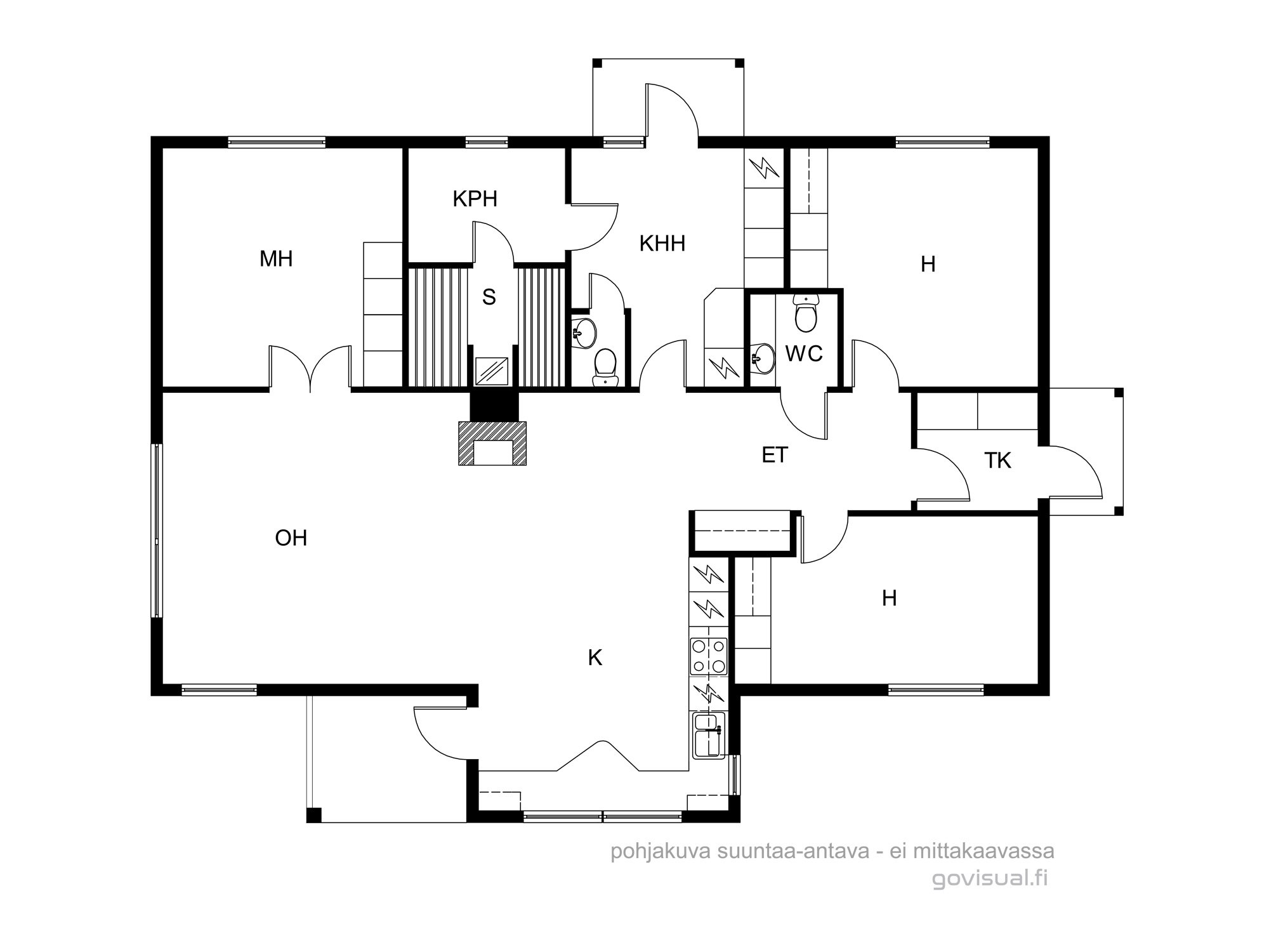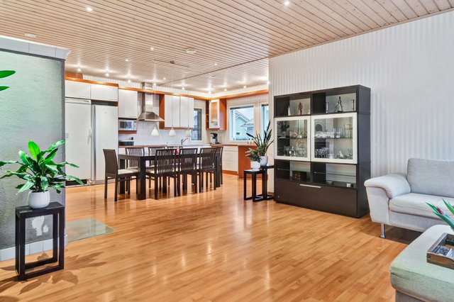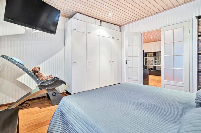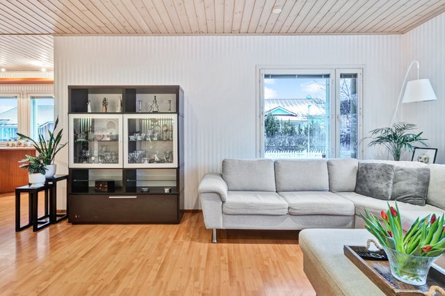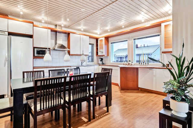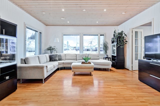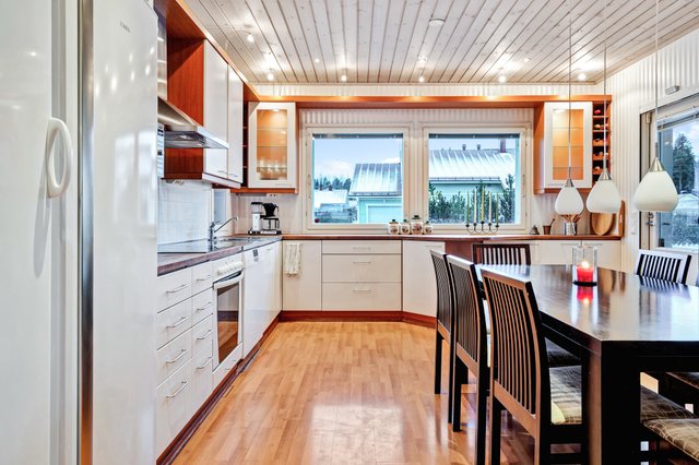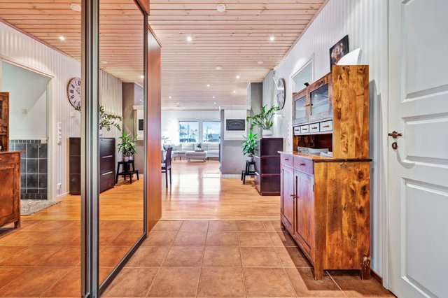 Talon pohjaratkaisu on mietitty huolella. Keittiö ja olohuone ovat yhtä isoa tilaa, talon isoin makuuhuone on sijoitettu olohuoneen viereen ja kaksi muuta makuuhuonetta sijaitsevat talon toisessa päädyssä. Kodinhoitohuoneesta käynti takaterassille/takapihalle ja keittiöstä käynti etupihan terassille. Kylpyhuoneessa kaksi suihkua ja saunassa puukiuas, joka tarjoaa erinomaiset löylyt. Kaksi erillistä WC:tä, joista toinen kodinhoitohuoneen yhteydessä ja toinen eteisen vieressä. Tuulikaapissa ja eteisessä liukuovikaapistot ja makuuhuoneissa omat kaapistonsa.