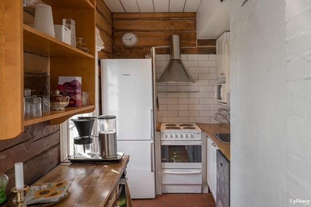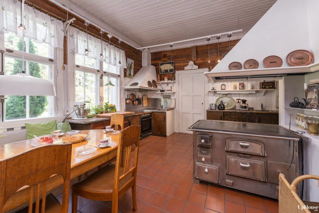 - Alakerran keittiö: Tilava keittiö, jossa runsaasti säilytystilaa. Keittiön yhteydessä on tarjoiluvälikkö. Varustelu: astianpesukone, jääkaappi, pakastin, sähköliesi, liesituuletin, uuni, puuhella, kylmäkomero, lämpökaappi lautasille. Seinät hirttä, osittain paneelia ja tapettia. Lattia laattaa. Yläkerran keittiö: Tilasta käynti kylpyhuoneeseen, jossa WC. Lattiat lautaa, seinät tapetoitu. Varustelu: keraaminen liesi, liesituuletin, jääkaappi/pakastin.