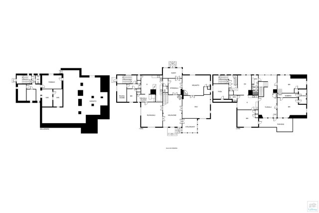 - Alakerta: Kylmä pohjoiskuisti ja eteläinen lasikuisti, eteishalli, kirjasto, sali, välihuone, ruokasali (ruokasalin pöydän alla lattiassa soittokello tarjoiluvälikköön ja keittiöön), tarjoiluvälikkö, keittiö, 2 makuuhuonetta, WC. Yläkerta: Avotakallinen ylähalli, 4 makuuhuonetta, 2 kylpyhuonetta. olohuone, keittiö + parvikamari ja 2 parveketta. Kellari: Osittain maanpäällä, ikkunallista tilaa runsaasti, käynti pariovista ulos. Sisäseinät osittain tiiltä. Pannuhuone, WC, paljon säilytys- ja harrastetilaa.