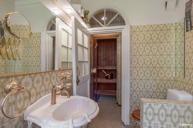 - Kylpyhuoneet yläkerrassa. Saunallinen kylpyhuone: Lattia laattaa, seinät kaakelia Varustelu: 2 kpl suihkuja, kylpyamme, pesuallas, WC-istuin, peili, lattialämmitys (ei saunassa). Kylpyhuone 2: Lattiat laattaa, seinät kaakelia. Varustelu: suihku, WC-istuin, pesuallas, bidee-suihku, lattialämmitys.