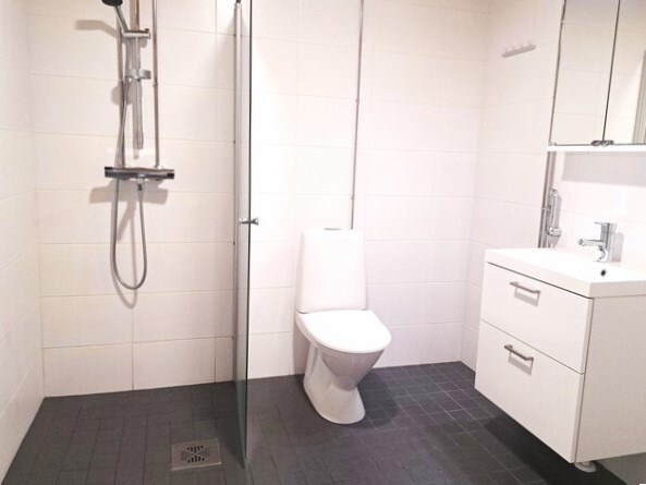 - Suihku, allaskaappi, lattialämmitys, suihkuseinä, wc-istuin, peilikaappi, pesukoneliitäntä, ja kiinteät valaisimet