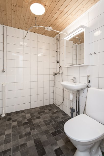 - WC-istuin, suihku, pesukoneliitäntä, lattialämmitys, peilikaappi, pesuallas, ja bidee-suihku