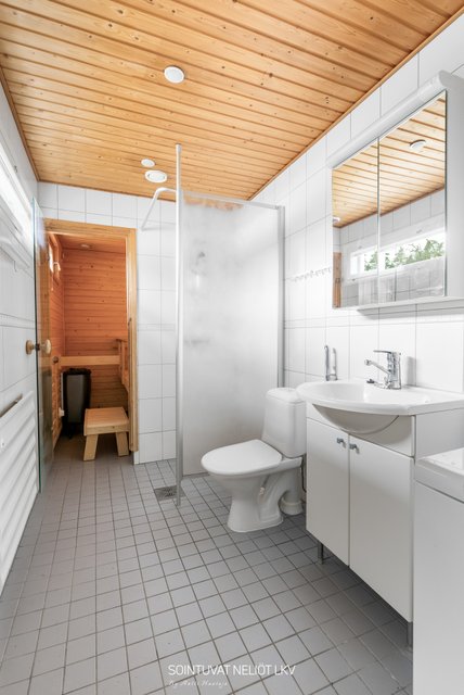 - WC-istuin, suihku, suihkuseinä, bidee-suihku, peilikaappi, pesuallas, allaskaappi, lattialämmitys (mukavuus), tilaa pesutornille, pesukoneliitäntä, ja pesukone