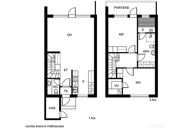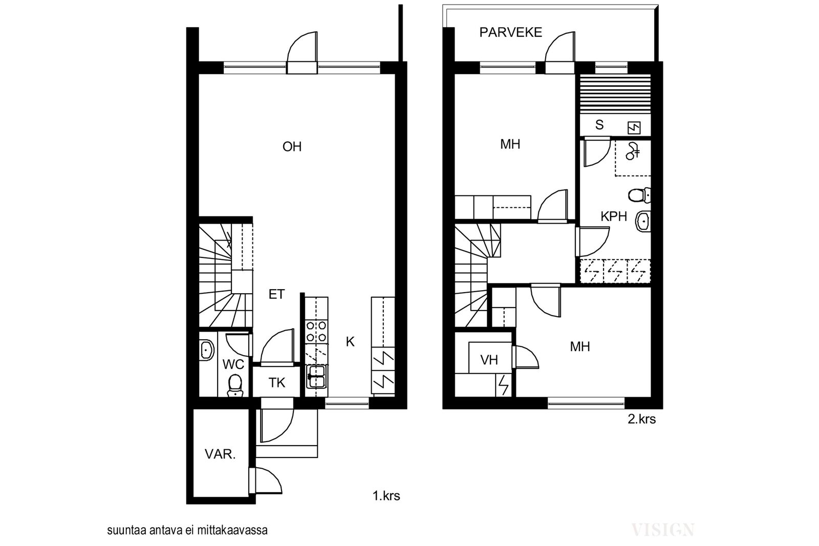 Alakerrassa sijaitsevat olohuone ja keittiö, jotka avautuvat suojaisalle pihalle, sekä erillinen wc. Yläkerrassa on kaksi tilavaa makuuhuonetta, joista toisessa vaatehuone ja toisessa parveke. Lisäksi yläkerrasta löytyvät kylpyhuone ja oma sauna.