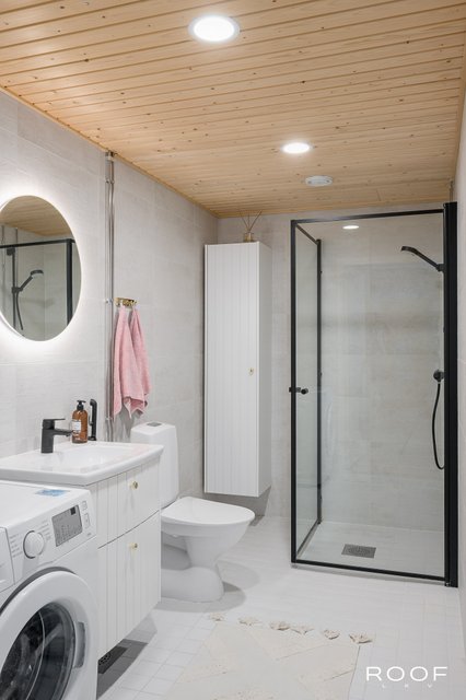 - Suihku, lattialämmitys, pesukoneliitäntä, wc-istuin, suihkuseinä, allaskaappi, peili, bidee-suihku, ja pesuallas