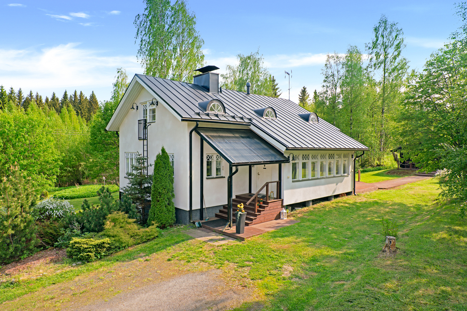 Asuinrakennus on yleisilmeeltään maalaisromanttinen ja sinne on tehty vuosien saatossa paljon remontteja sekä perusparannuksia. Talossa on uusittu vuosien saatossa mm. keittiö v. 2014, käyty läpi sähköt, parannettu yläpohjan ilmanvaihtoa, rakennettu isot terassit ja tehty laajasti pintaremonttia. Mitään isoa remontin tarvetta ei ole tiedossa. Asuinrakennuksen yhteydessä lämmin autotalli, jossa myös kaivo. Keittiössä ja kodinhoitohuoneessa laadukkaat ja ajattomat kivitasot. Kaksi vessaa, joista toinen keskikerroksen kodinhoitohuoneen/kylpyhuoneen yhteydessä ja toinen yläkerrassa. Alimmassa kerroksessa hyvin säilytystilaa. Suihkusta käynti lasiverannan ja terassien kautta pihasaunalle, joka lämpiää puulla. Sisäsaunan lämmitys sähköllä.