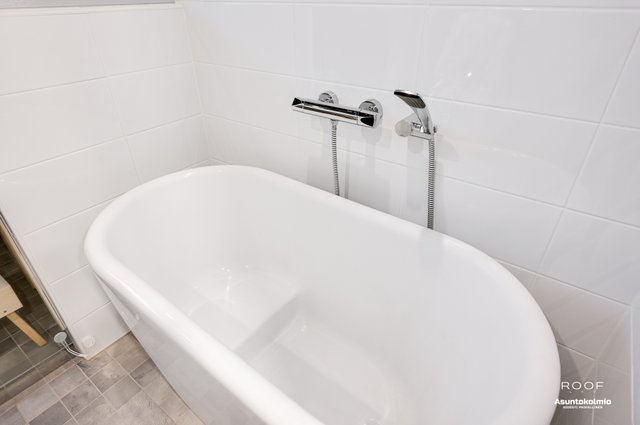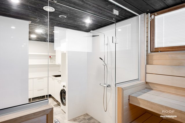 - Pesukoneliitäntä, tila pesutornille, lattiakaivo, ja pesuallas