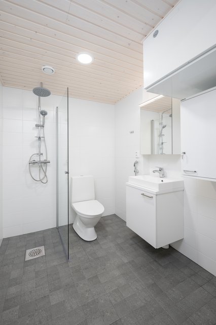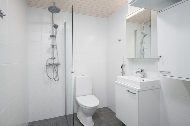 - Suihku, wc-istuin, pesukoneliitäntä, lattialämmitys, peilikaappi, pesuallas, allaskaappi, bidee-suihku, ja suihkuseinä